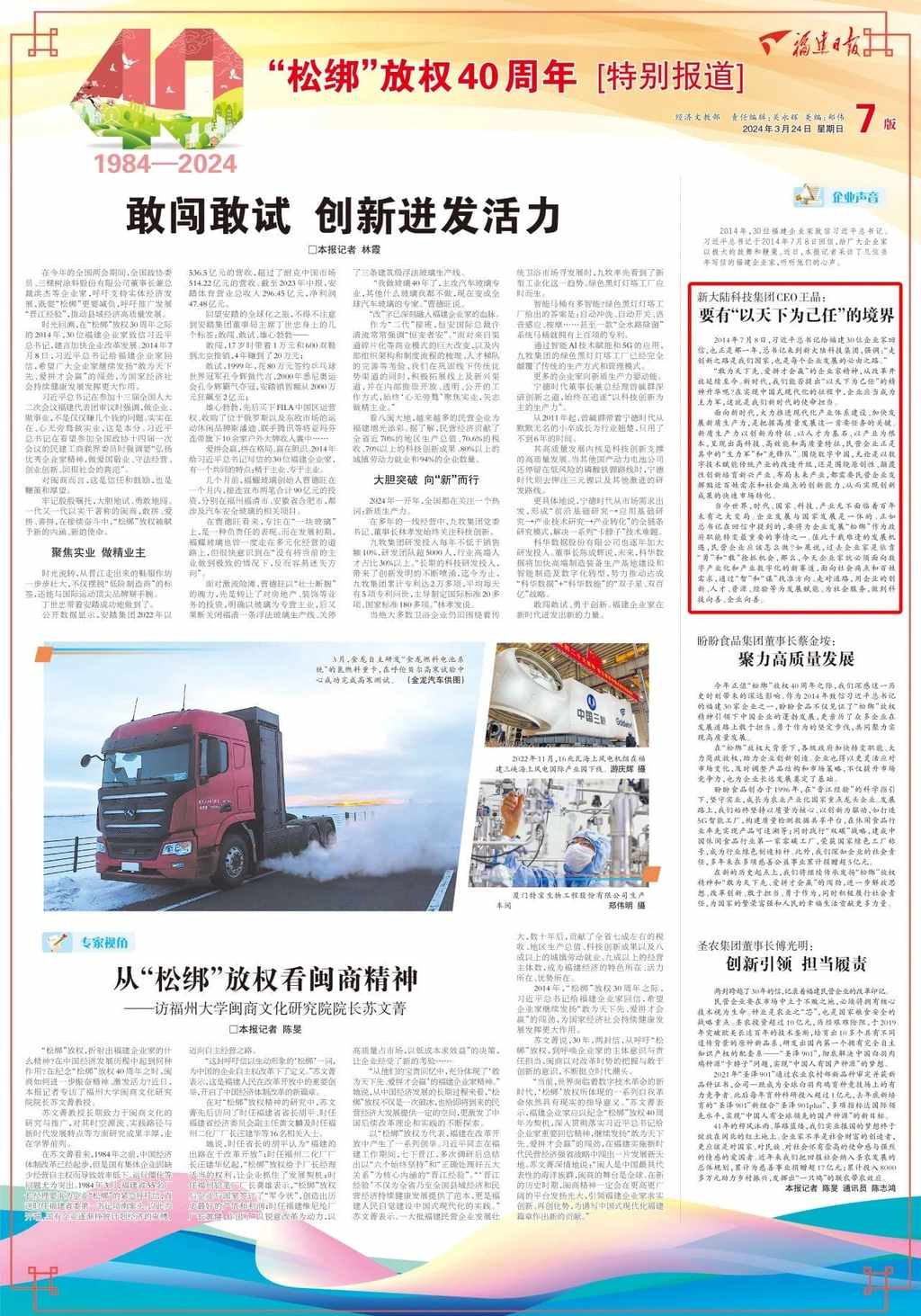 值此習近平總書記回信十周年之際,福建日報推出6版《“松綁”放權四十周年特別報道》,特別專訪當年寫信的企業家代表新大陸科技集團CEO王晶。今日官微轉發報道全文,以饗讀者。